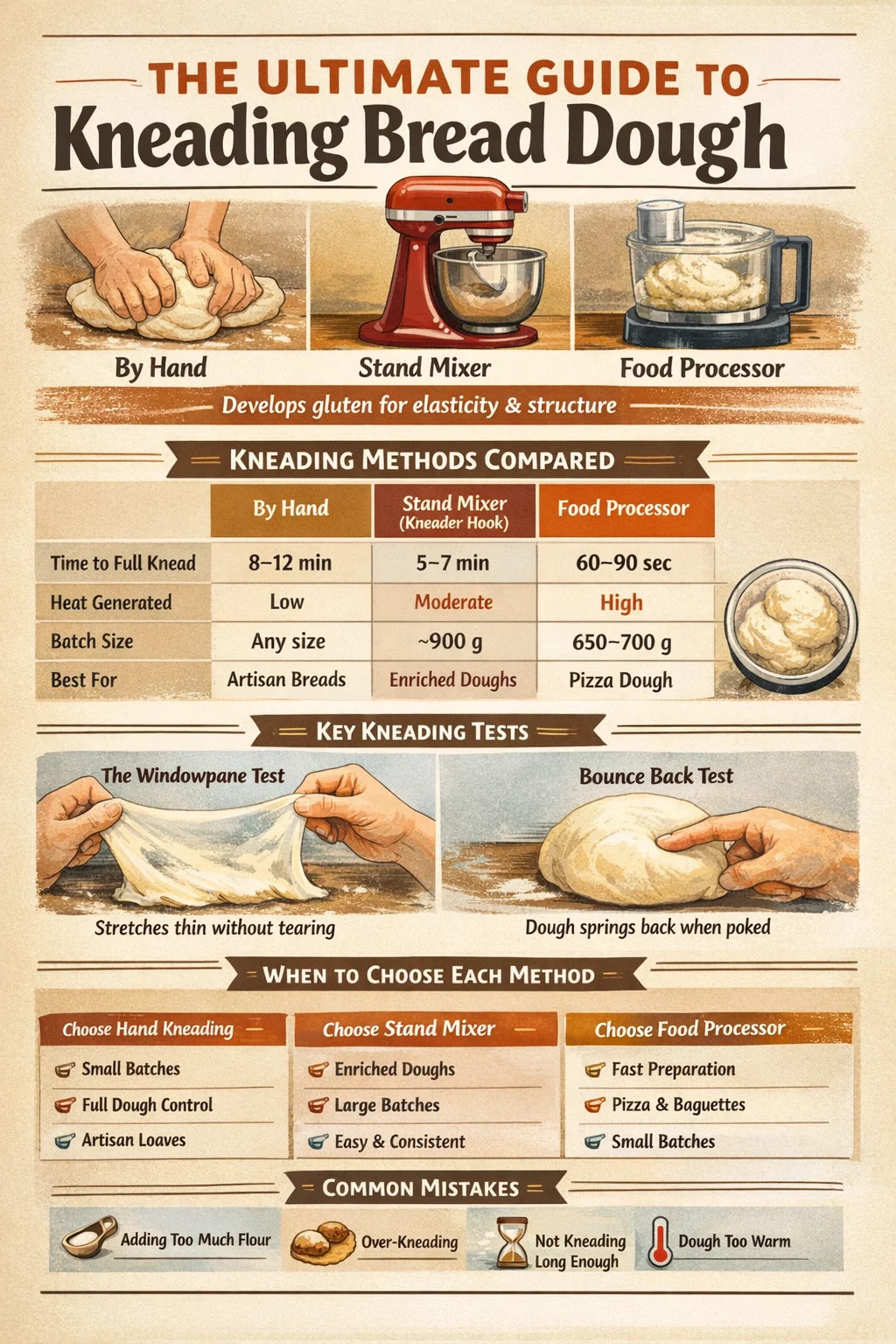 Ať už připravujete sendvičový chléb, těsto na pizzu nebo měkké rohlíky, hnětení je krok, který určuje vše. Těsto efektivně uhnětete ručně za 8–10 minut, se stojanovým mixérem za 5–7 minut nebo kuchyňským robotem za pouhých 60–90 sekund. Každá metoda aktivuje lepek odlišně a vyhovuje různým pekařům v závislosti na jejich nástrojích, velikosti šarže a míře fyzického zapojení do procesu. Tato příručka podrobně pokrývá všechny tři metody – včetně techniky, načasování, běžných chyb a toho, kdy přesně použít a hnětač příloha versus dělat to ručně.