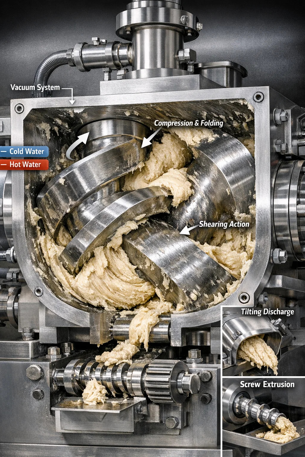 A hnětač funguje na stejném principu jako domácí hnětení těsta, ale využívá nesmírnou mechanickou sílu a sofistikované kovové konstrukce. Nejde jen o prosté „míchání“, ale spíše o zpracovávání extrémně viskózních materiálů, které běžné lžíce nezvládnou opakovaným „hnětením, mačkáním, taháním a trháním“.