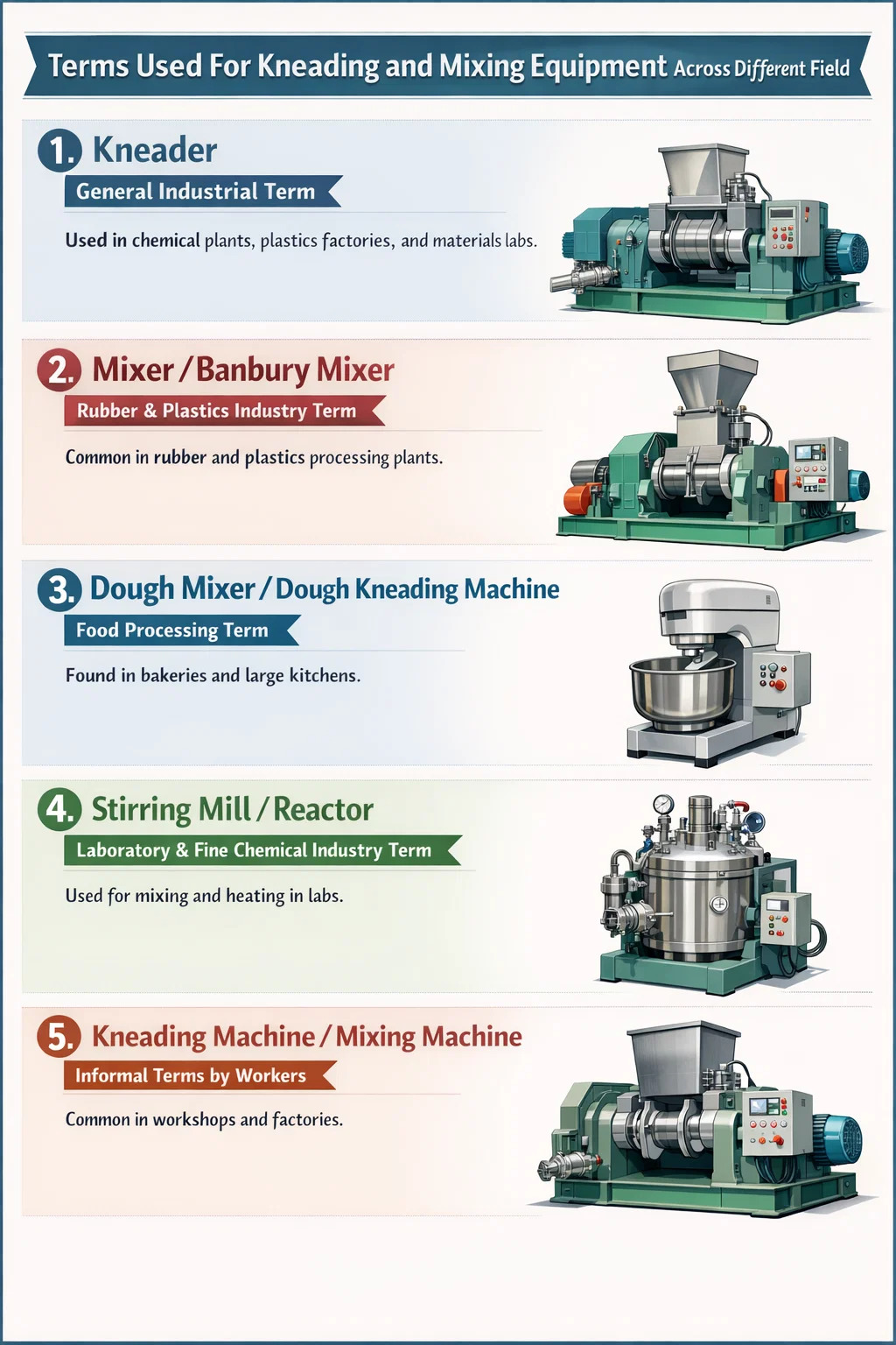 Pokud jde o zařízení jako „hnětací stroje“ nebo „míchače těsta“, jejich názvy se v různých oborech a odvětvích značně liší. Přestože jejich hlavní funkcí je míchat materiály pomocí výkonného hnětení, názvy, které lidé používají, se výrazně liší v závislosti na aplikaci.