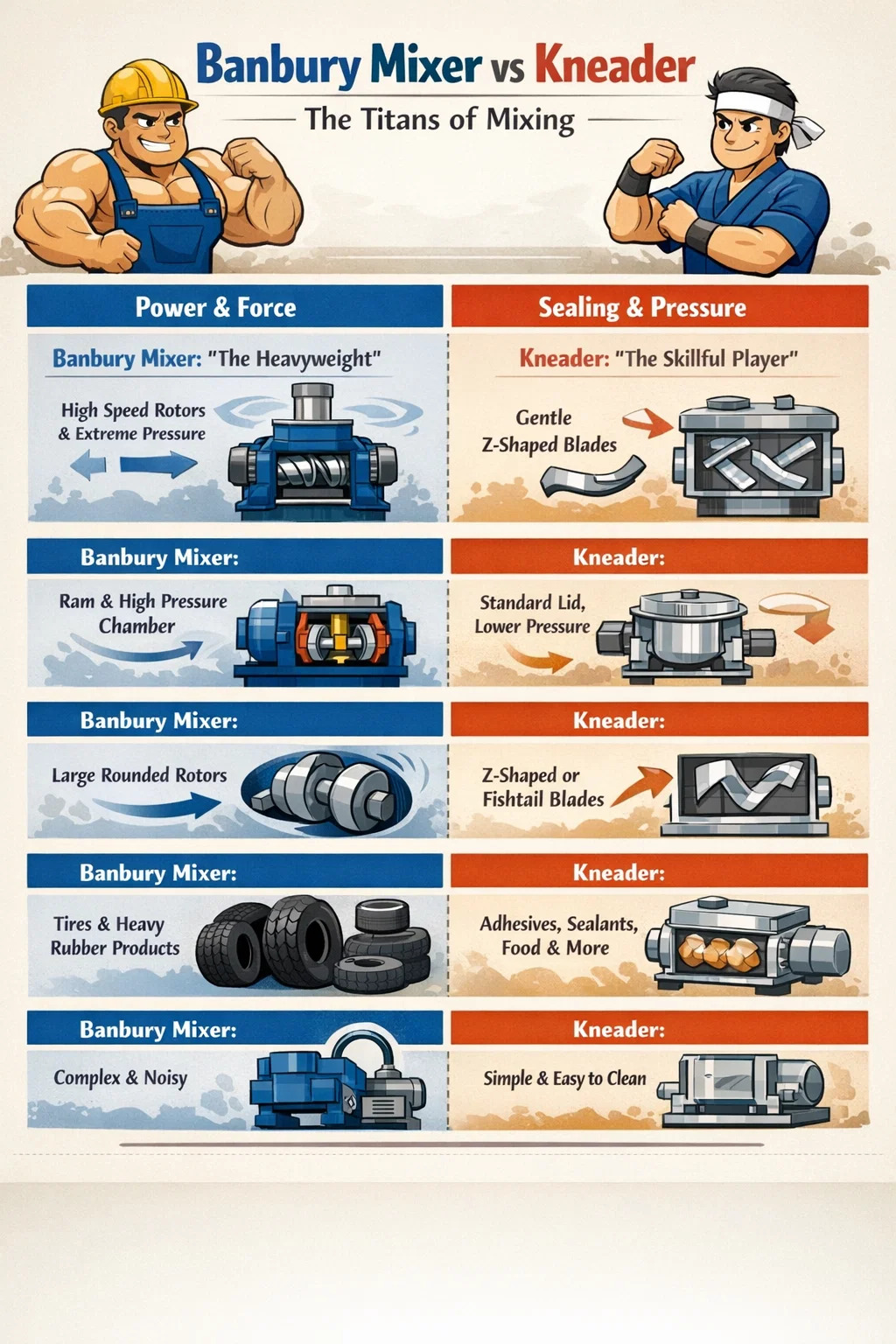 Ve světě zpracování pryže a plastů jsou **mixéry a hnětače Banbury** jako dva silní muži s různými osobnostmi. Zatímco oba dokážou rovnoměrně míchat viskózní suroviny, výrazně se liší svými pracovními metodami a výkonem.